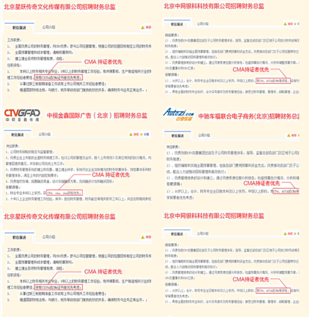 CMA被世界500强和央企国企作为评估录用高级人才的衡量标准,现在很多知名企业在招聘中高级岗位时都会要求持有CMA证书。